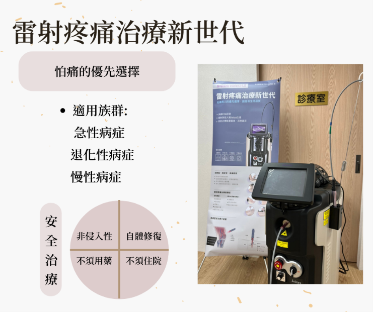 雷射是疼痛治療時,怕痛病人的優先選擇;急性期止痛,短時間消除水腫,加速血管新生,加快組織再生,退化及慢性症狀抗發炎的最新利器。